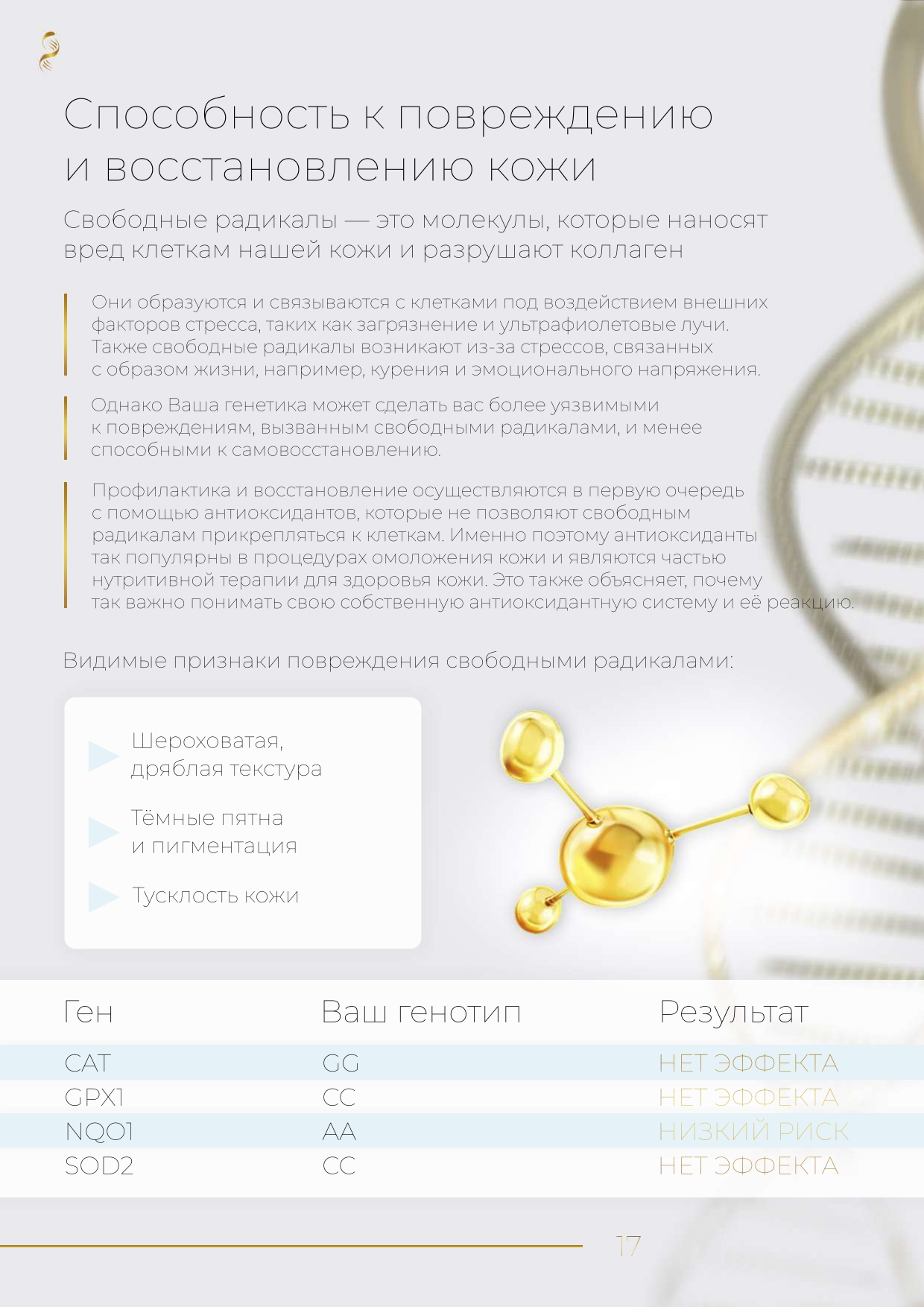 +7 (812) 426-19-14ДНК-тест Skin Care (генетика красоты) помогает понять, как именно ваши гены влияют на состояние кожи и волос. Это не медицинский диагноз, а персонализированный генетический отчёт, который показывает врождённые особенности организма и даёт рекомендации по уходу.